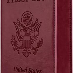 Passport and Vaccine Card Holder Combo, PU Leather Passport Holder with Vaccine Card Slot Passport Case Cover Protector Wine Red Passport Wallet for Men Women Family