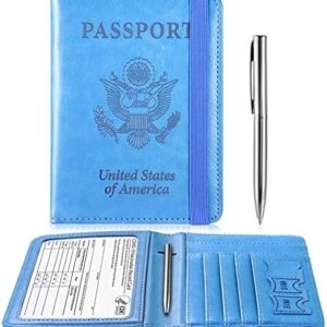 Passport and Vaccine Card Holder Combo, Leather Passport Wallet RFID Blocking with Elastic Strap & Pen Travel Passport Cover Case, Passport Holder with Vaccination Card Slot, Turquoise