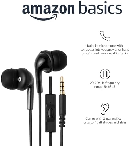 Amazon Basics In-Ear Wired Headphones, Earbuds with Microphone, Black