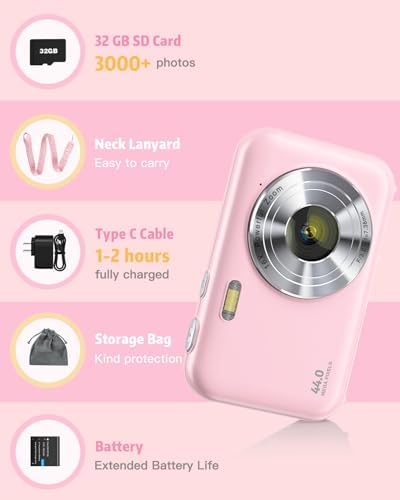 Digital Camera, FHD 1080P Kids Camera with Neck Lanyard 32GB Card Battery, Anti-Shake 16X Digital Zoom, 44MP Point Shoot Cameras, Compact Portable Small Gift Camera for Kid Teen Student Girl Boy(Pink)
