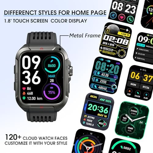 ⌚【METAL FRAME & BUTTONS/TOUCH SCREEN HD COLOR DISPLAY】1.8-inch large touch screen provides excellent high-definition color image quality. Switch to 120+ different screen styles with one touch, supporting upload custom pictures. Flip your wrist to automatically wake up the screen, 5 levels of the screen brightness can be set.