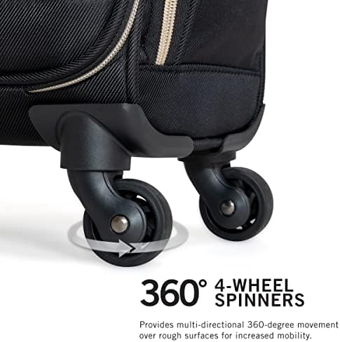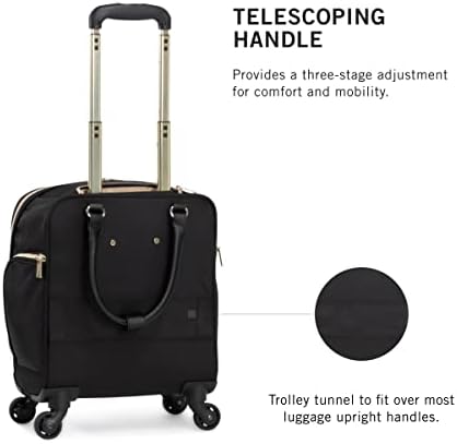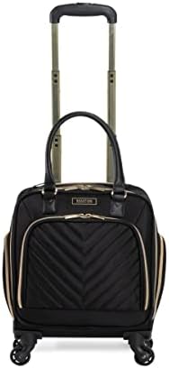 Lighten your load by packing your essentials in this polyester twill chevron-quilted 4-wheel spinner underseater from designer Kenneth Cole’s Chelsea luggage collection, great for a weekend getaway or your daily commute. The bag’s lightweight construction helps you meet airline weight restrictions, avoiding unnecessary airport fees, while its 4-wheel spinners allow for effortless 360° navigation, getting you where you’re going faster. With its durable, polyester twill, chevron-quilted exterior and tear-resistant, fully lined interior take comfort in knowing that your belongings are stored safely inside. The bag’s front compartment interior includes a padded tablet pocket and organizer pockets to store smaller items, while the side exterior features two zippered pockets to hold a water bottle or other smaller items. The main compartment consists of a zippered pocket, two shoe pockets, and garment restraints and is just the right size for a short business trip or a weekend away. The bag features a retractable trolley handle extends to be 41” tall with a locking push-button mechanism, as well as a rear exterior trolley tunnel to fit over most luggage upright handles, for hands-free carrying. Additional top handles allow for comfortable and easy lifting. Meets most U. S. based airline carry-on size requirements and fits into most airline overhead bin compartments. ★ Overall Dimensions: 17” H x 13” L x 9” D (includes wheels). ★ Internal Packing Dimensions: 15” H x 12.5” L x 8.5”D. ★ Product Weight: 5.6 lbs. ★ Backed by a manufacturer 10-year limited guarantee against defects. ★ The perfect fashion-forward women’s underseater business carry-on for those whom value both style and function.