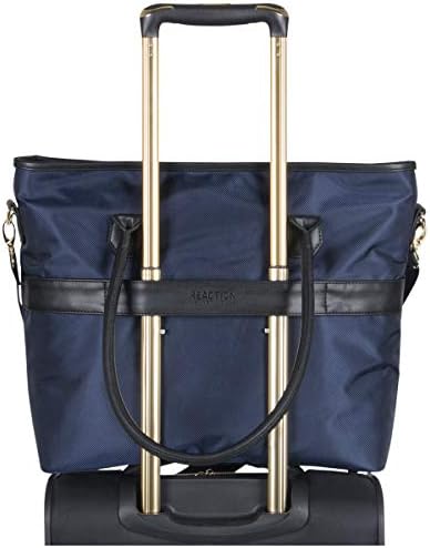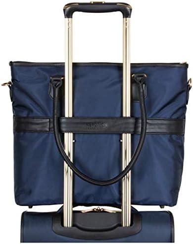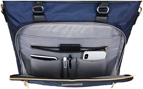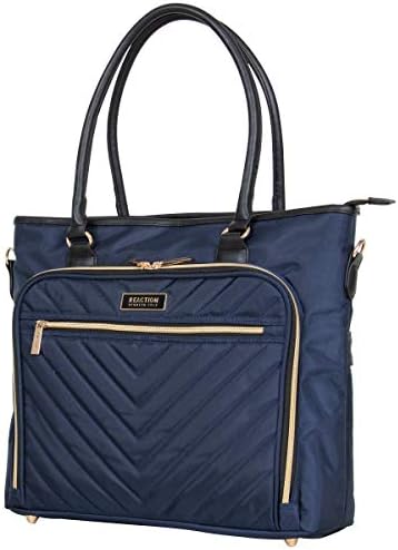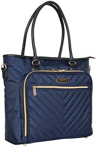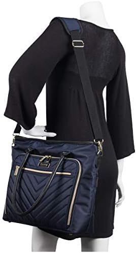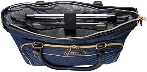 A must-have tote, fashionable enough for everyday use. The stylish, polyester twill exterior with chevron quilted detail and a tear-resistant, fully-lined interior and sturdy construction with a large single compartment and eye-catching, distinctive gold hardware make this bag great for business and travel alike. The laptop pocket is padded to fit most laptops with up to a 15-inch screen, and a separate padded tablet pocket fits most tablets. The front exterior has an easy-access zipper pocket for frequently needed items. A zip around front organization compartment with an open Slip Pocket and zippered pockets holds all of your business essentials. The main compartment includes a padded tablet pocket, laptop pocket, and zipper pocket, while still leaving plenty of room to store other needed belongings. The rear exterior features a trolley strap to fit over most luggage trolley handles for hands-free carrying, and tote style handles made to be worn over the shoulder allow an 8.5-Inch handle drop. Another carrying option is the removable, adjustable, padded shoulder strap that extends to be 52 inches long. Perfect tote for work, school, college, as a gift, for valentine’s day or Mother’s Day, or to hold all your needed belongings on your commute to work. A straightforward and stylish tote, great for business, travel, or everyday use. ★ Overall Dimensions: 17” L x 13” H x 5” D. ★ Laptop pocket Dimensions: 15” L x 10.5” H x 1.0” D. ★ Weight: 2.15 lbs. ★