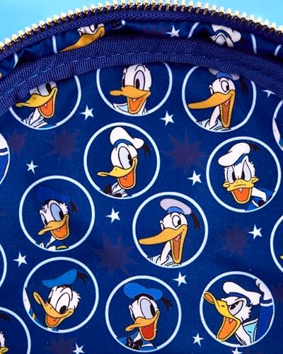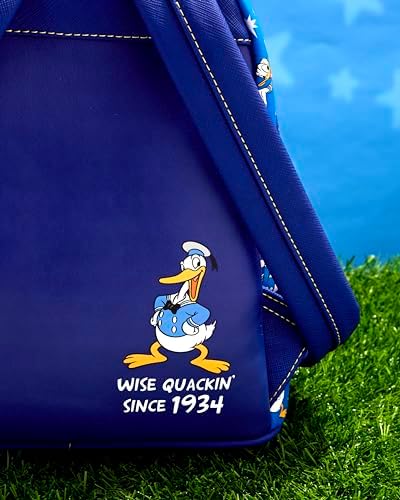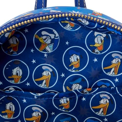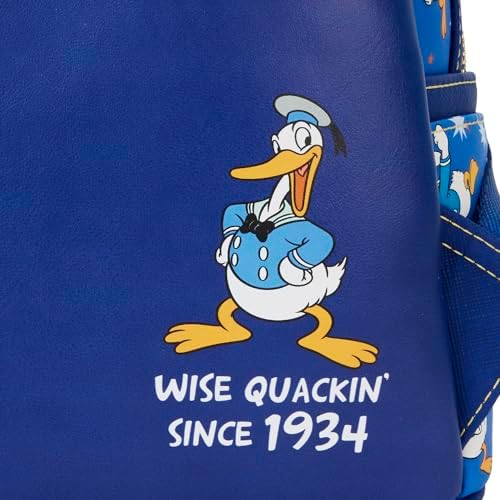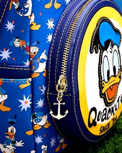 From Disney, this mini-backpack features Donald Duck! Featuring incredible detail to bring Donald Duck to life, this Loungefly mini-backpack is made of vegan leather (polyurethane), has a front zipper compartment, side pockets, and adjustable back straps. Inside, the backpack continues the theme with unique, coordinating lining. Bring home a piece of Disney today! “THIS ITEM IS NOT INTENDED FOR USE BY CHILDREN 12 AND UNDER”