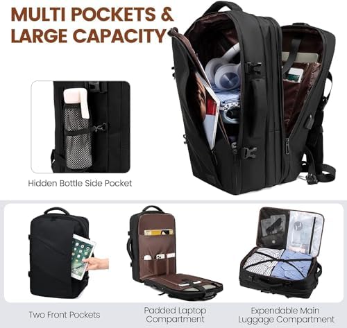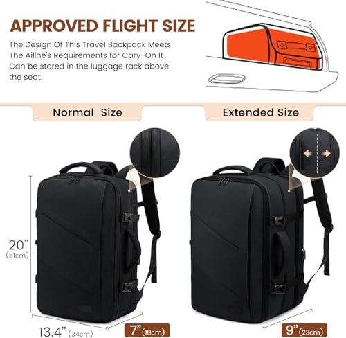 ✈【Flight-Approved Large Travel Backpack】The carry on backpack features an expandable design. Before extended is 30L and its dimensions are 13×6.5x20in; after extended is 40L and its dimensions are 13x9x20in. You can easily pack 3-5 days of travel gear. The luggage backpack meets the maximum size allowed by IATA flights and can be fitted overhead compartment and under the seat in flight. The largr backpack is perfect for camping, plane trip, hiking, business trip, and other outdoor activities.