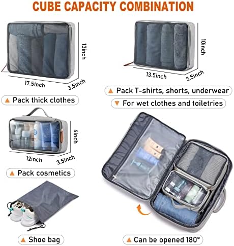 [EXTRA 4 PACKING CUBES] Travel backpack with four packing cubes. large cube for sweaters, jackets, pants. Medium cube for shirts, shorts. Small cube for toiletries such as makeup, cleanser, etc, there’s also a shoe pocket. Keeping your belongings neater and more organized. without a doubt it’s a large travel backpack. If your clothes get wet, don’t worry, there is a wet pocket at the top of the large compartment, which can hold 2 T-shirts or towels