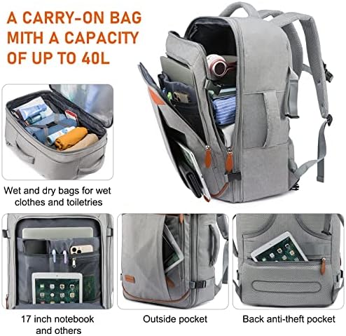 [LARGECAPACITY EXPANDABLE ]45L travel backpack expandable, can hold the necessary items for 3~7 days of travel, can accommodate three or four sets of clothes, shoes(Comes with a separate shoe bag), and Other daily necessities. The computer compartment can hold a 17-inch laptop. The capacity before expansion is about 35L, and it is 45+L after expansion. It is an ideal travel backpack for men and women