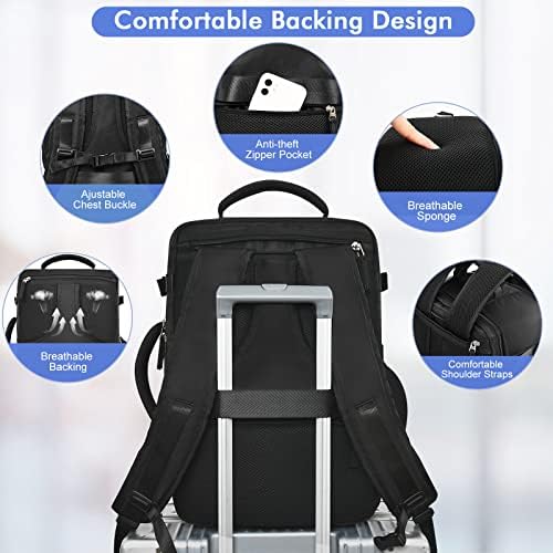 【Large Capacity and Multi Pockets】Carry on backpack with large storage capacity and two free two toiletry bags. Multiple zippered pockets give you plenty of storage space, including a front pocket, waterproof section, main compartment, separate laptop compartment, and anti-theft pocket on the back. In addition, this traveling backpack also has a mesh slip-in pocket with elastic closure on the left side for a bottle or an umbrella.