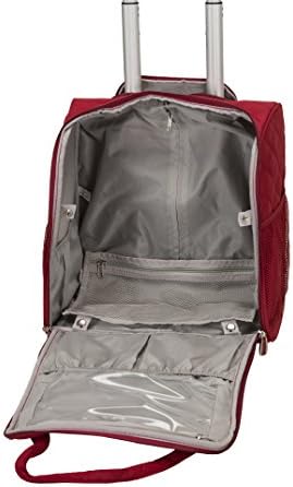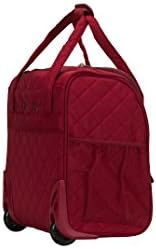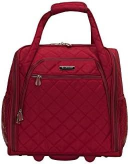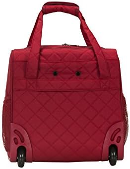 Carry all your essentials in style and comfort with the Rockland wheeled under seat carryon bag. Quilted polyester fabric exterior features a large main compartment for clothes, shoes and also has 2 slip pockets and two zippered pockets for keeping small essentials handy and organized. Retractable handle stores away while hand held handles allow for quickly grabbing bag from overhead bin or underneath seat. Back side has a strap allowing you to attach it to your wheeled carry on piece. This makes the perfect bag for overnight trips and the small size fits under near most airline seats allowing you to carry on your bag even when overhead bins are full.