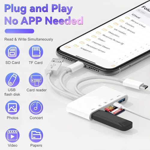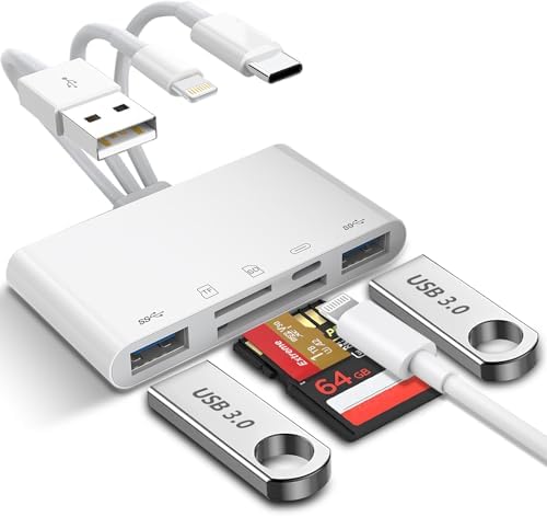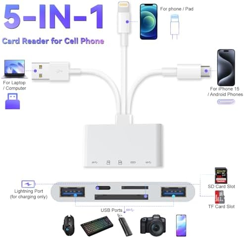 Dual USB Ports, SD+TF Card Slot, Lightning Charging Port, 5-in-1 design meet all your needsUSB-A+USB-C+Lightning 3-in-1 connectors compatible with all major electronic devicesPlug and play, no driver or App required, just connected and read/trasnfer files immediately5 ports can be used at the same time, you can even charge your iPhone/iPad with the lightning port while reading files (charging function only limited at iPhone/iPad devices)Portable size, perfect to take for travelling with camera and transfer photos/video from memory card to your phone without the computer
