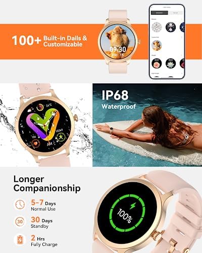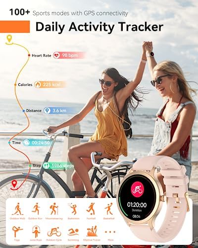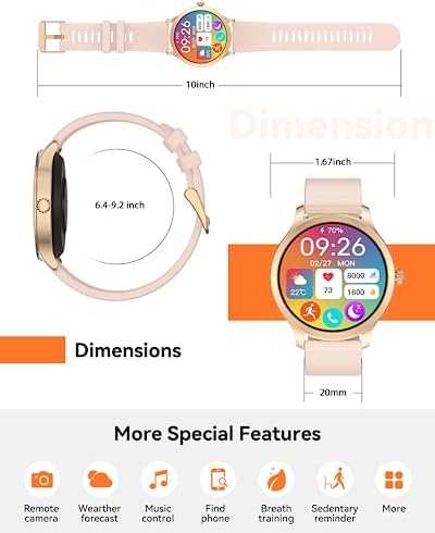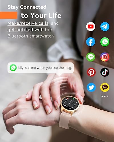 đăHands-Free Calls & Smart NotificationsăLiberate hands with the smart watch and make calls from your own wrist. With a built-in speaker and microphone, calls become easy to make, whether you’re exercising outdoors or tidying up at home. Once paired with your phone, you can make, receive and reject calls and view call logs directly on the smart watch for women. Stay connected to SMS and APP messages(Text, Facebook, WhatsApp, Instagram, Twitter, etc.), never miss any important information.