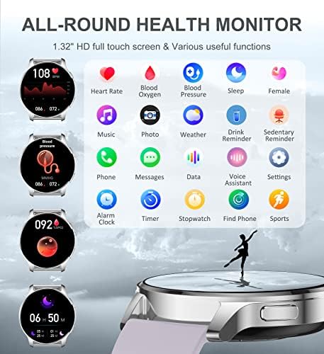 ROUND SMART WATCHES FOR WOMEN: Ultra-thin metal frame with 1.32″ HD full touch color screen brings smooth touch and excellent visual experience. There are 200+ free dials for you to choose from, you can also change your favorite picture as a watch face. Comes with 3 bands, the silver stainless steel one is exquisite, while the purple and beige silicone bands are more casual, switch between elegant and sporty, ignite your passion for fashion!