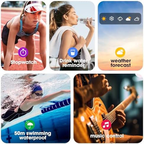 Water-Resistant for Swimming: With a 50-meter waterproof rating, our watch is ideal for swimming and water activities. It includes features like a stopwatch, pedometer, breathing exercises, music control, photo control, weather forecast, women’s health reminders, and mobile phone search.