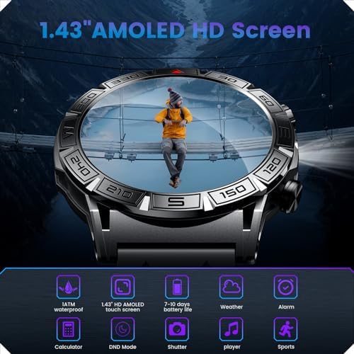 AMOLED round smart watch for men: This smart watch HD resolution full touch screen, Zinc alloy top cover, sturdy and durable; 1.43″ amoled screen for better visual comfort, smooth touch screen and scratch-resistant. The watch comes with two straps, silicone and steel; Easy to change the strap, both texture and comfort. The smart watch has built-in different styles of watch face and supports uploading photos for customization. Men’s watch for outdoor, sports, home and office