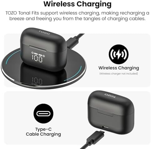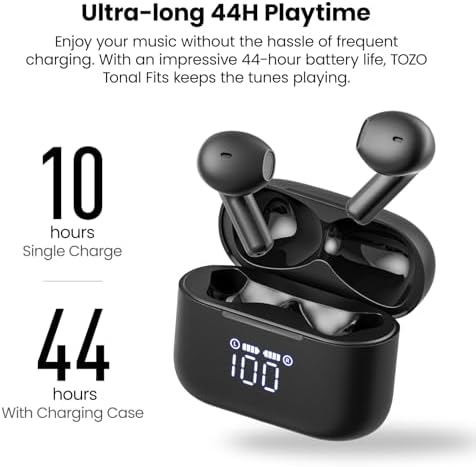 【Extra Long Playback &Dual Power Display】 Tozo Tonal Fits(T21) offers up to 6 hours playback on a single earbuds charging and an additional 44 hours of the convenient wireless charging case. Featuring integrated LED digital display, you can easily keep an eye on the remaining battery life of each earbuds and charging case, always be ready.