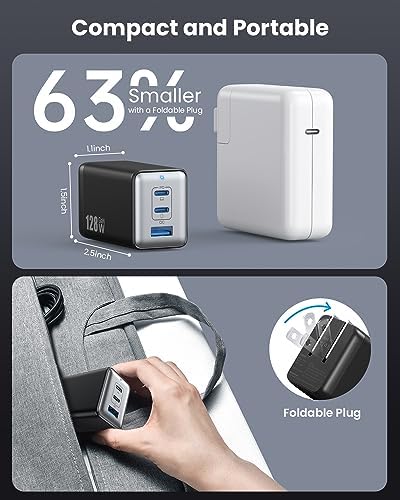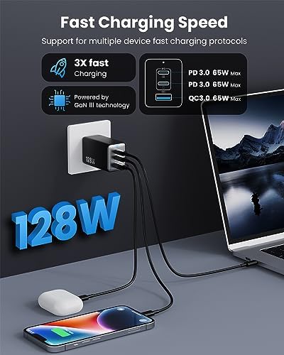 USB C Charger 128W Wall Charger,(GaN III)3 Port Fast Charging Station, Foldable Wall Charger Adapter for MacBook Pro/Air,HP,ThinkPad,Dell XPS,iPhone 15/14,Pro,iPad Pro/Air,Galaxy S23,Steam Deck,etc