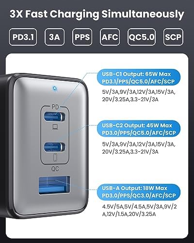 A GaN chip combined with foldable plug design makes this 65W charger small enough to fit in the palm of your hand without a sacrifice in quality or power. Very suitable for long-distance travel or business trips.3 in 1 charging station for multiple devices; Widely compatible, goodbye messy desktop.Compact and exquisite appearance, easy to carry; Built-in cooling pad, multi-layer safety protection.90° Folding charger, Simple to storage, Wherever you go, and protects your other devices from scratches.GAN III technology, efficient and fast charging; Save space, save time, save money, get it now!In charger market, gallium nitride (GaN) is rapidly replacing silicon (Si) as the new darling of the consumer electronics track, which is faster, smaller and consumes less energy.